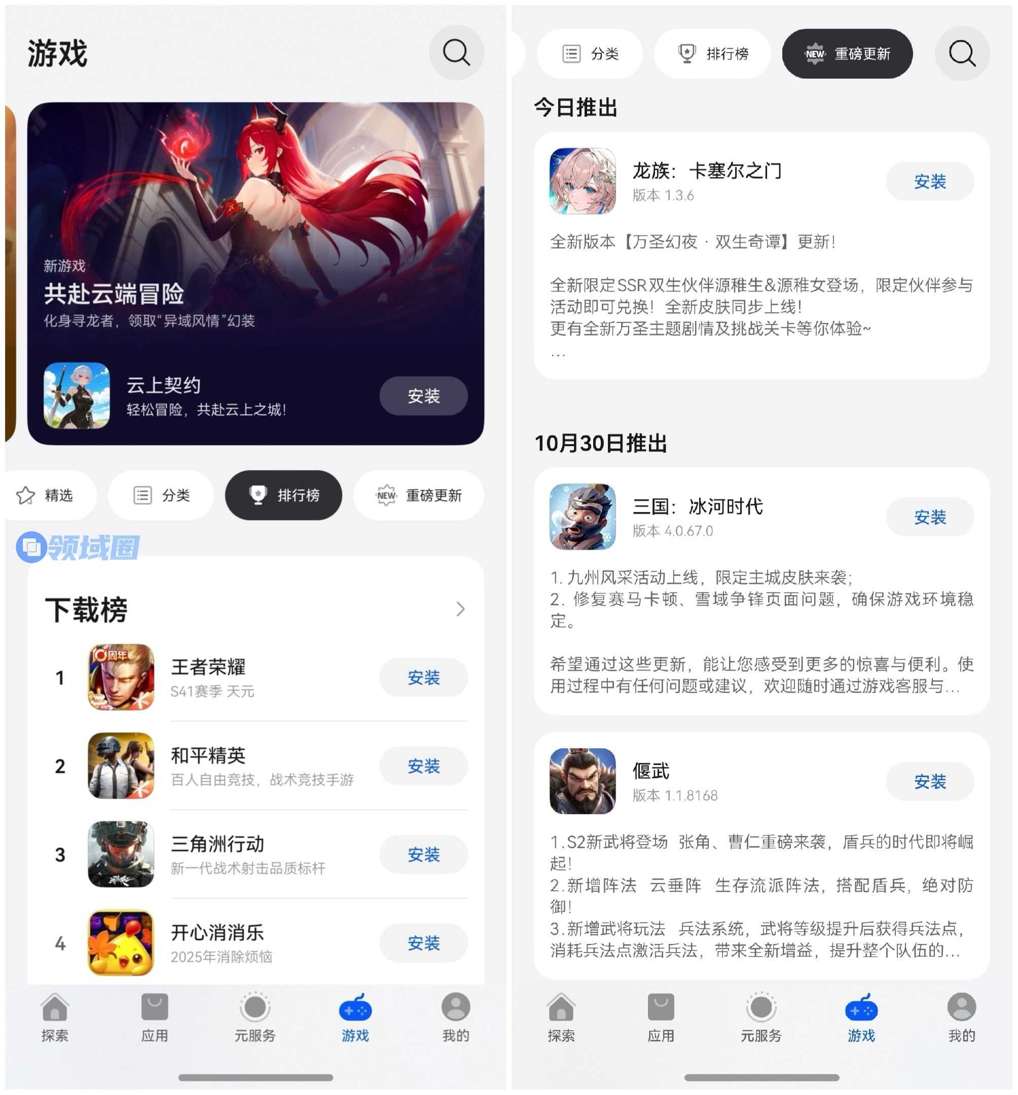 除了直接搜索APP,还可以在“应用”或“游戏”页探索。通过“排行榜”类别探索应用,可以到“下载榜”看人气,“口碑榜”看评价,发现宝藏APP!在“重磅更新”列表,可以查看已有头部APP近期的核心功能迭代、体验升级,一手掌握头部APP核心迭代,及时尝鲜优质体验。
