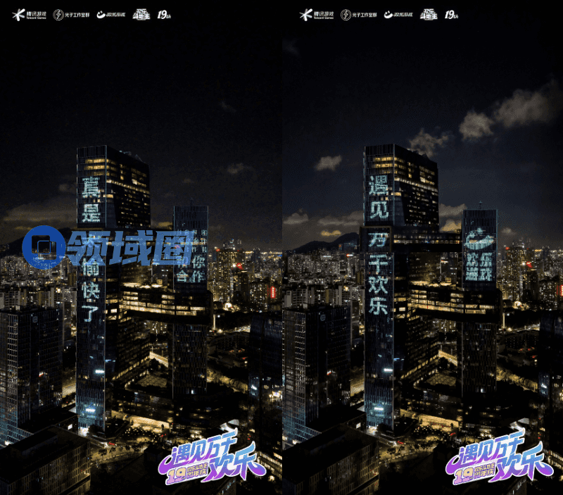 要说最吸睛的,还得是腾讯滨海大厦的“高调官宣”:大厦前摆上了巨型“地主抱欢乐豆”气模,大楼外墙还滚动播放“欢乐斗地主,遇见万千欢乐”以及游戏里的经典“黑话”,引得路人都忍不住停下打卡拍照,仪式感属实拉满!