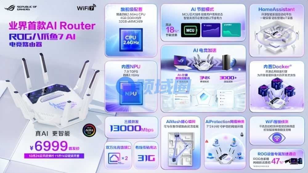 该路由器采用了创新三核架构(CPU+NPU+MCU协同),在行业内首次导入NPU,拥有7.9 TOPS算力与四核2.1GHz架构,实现了真正的AI智能路由。其AI电竞加速引擎以QoE为核心,智能优化流量,实现更低游戏延迟,支持多达3000多款热门游戏的优化;AI节能模式则通过搭载MCU芯片,实时感知用户用网状态,智能关闭非必要的功能以节省电力,至高可达18%的节能效果。更引人注目的是,ROG八爪鱼7 AI算力充裕,它的系统支持内置Docker,为开发者提供高度灵活的开发环境,同时能一键安装HomeAssistant开源智能家居自动化平台,让用户轻松管理不同品牌的loT设备。这款ROG八爪鱼7 AI电竞路由将于2025年10月24日开启预约,2025年11月14日正式开售,售价为6999元。