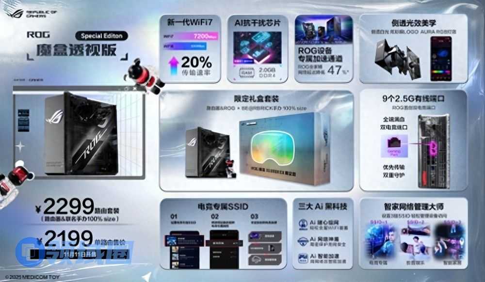 值得一提的是,本次新品超玩会特别推出的是ROG魔盒BE@RBRICK礼盒,除路由器本体外,还包含1个ROG X BE@RBRICK手办100% size,为电竞爱好者带来极具收藏价值的惊喜之作。ROG魔盒BE@RBRICK礼盒售价为2299元,2025年10月16日开启预约,2025年11月11日正式开售;ROG魔盒透视版路由器售价为2199元。