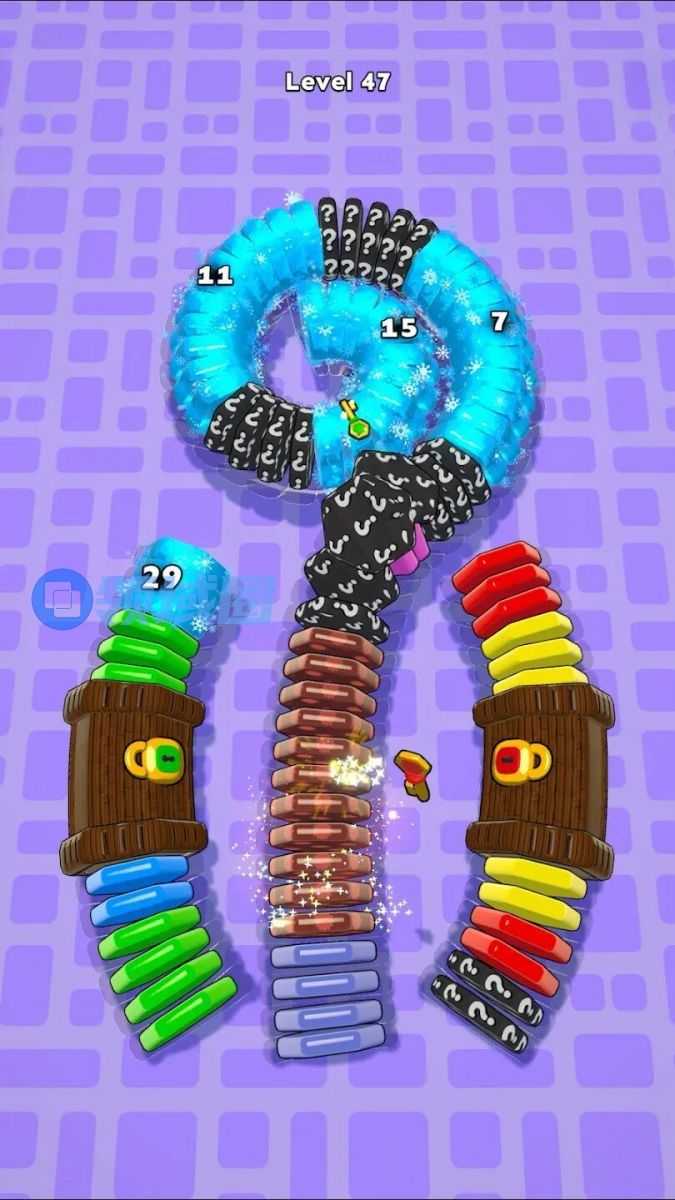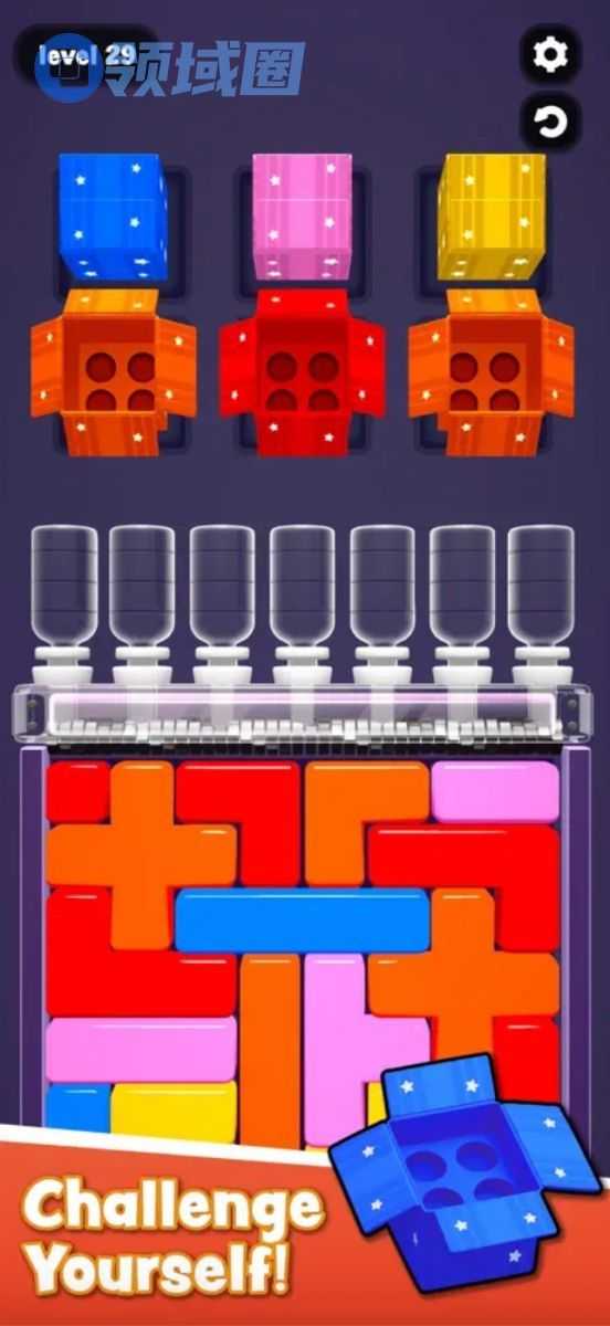 介绍:Rollic出品的一款精致超休闲,底部是各色各个形状的砖块,重心向上,玩家点击后对应砖块碎裂化成果汁注入到对应的瓶子里,然后瓶子装满后则会收入上方的对应打包盒中。是一款几何Block+Jam的组合玩法。