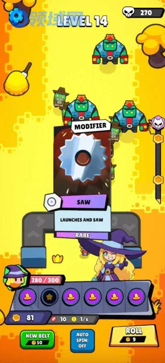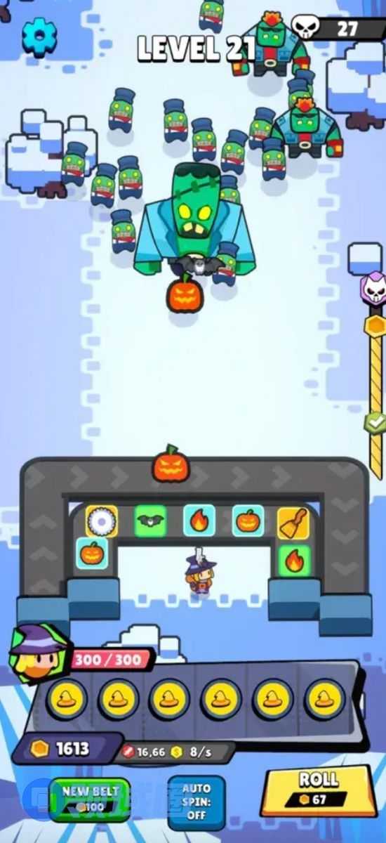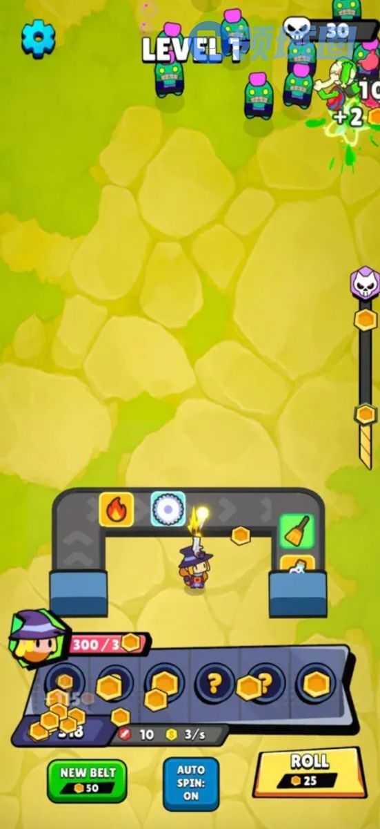 玩法是玩家待机获得金币,然后花费金币进行Roll,不同结果获得不同奖励,比如获得金币、获得各种武器、获得buff等。获得到的武器会放置在传送带上,玩家英雄的攻击穿过传送带上的武器,则视为“激活”武器,则可以发动对应武器的攻击,比如喷火、毒液、召唤蝙蝠、连射等等,可惜前期数值横向拓展的太慢,前面玩着感受比较磨叽,如果好好做一下前期的成长循环拓展,其实这个原型还不错。