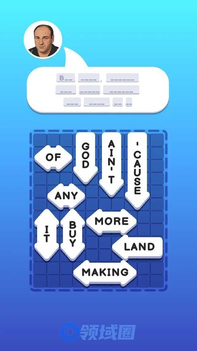 介绍:用一些名人名言、著名歌词、电影台词等鸡汤句子当作“正确答案”,玩家需要根据句子各种单词的长短用关卡中的各个方向的单词拼写出正确的句子,单词都放在各种箭头里,规则类似挪车,玩家可以将对应箭头按照对应方向和顺序挪出,最终拼成正确的句子即可。