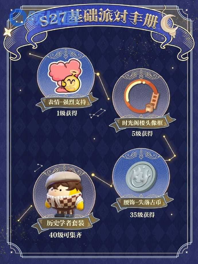 “织梦寻星季”派对季的派对手册分为基础版和高级版两部分,相应的奖励各不相同。本季基础派对手册的全部奖励有:800潮流纤维、17500瓶盖、稀有表情“强烈支持”、高级头像框“时光阁楼头像框”、稀有配饰“失落古币”、高级装扮“历史学者套装”。
