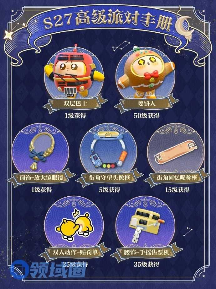 将派对手册升级为高级后,还能获得总价值3288蛋币的超值奖励。除了300蛋币、30彩虹币、20盲盒染色剂、20配饰染色剂外,还可获得稀有盲盒“双层巴士”、典藏配饰“放大镜眼镜”、稀有头像框“街角守望头像框”、高级昵称框“街角回忆昵称框”、典藏动作“贴罚单”、典藏配饰“手摇售票机”和稀有盲盒“姜饼人”外观。