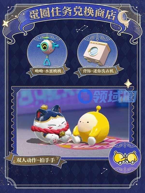“织梦寻星季”派对季盛大开启,蛋仔们可通过蛋圈页面进入蛋圈任务,和蛋圈成员一起组队完成任务,即可兑换呦呦“水蜜桃桃”、配饰“迷你洗衣机”和双人动作“拍手手”!