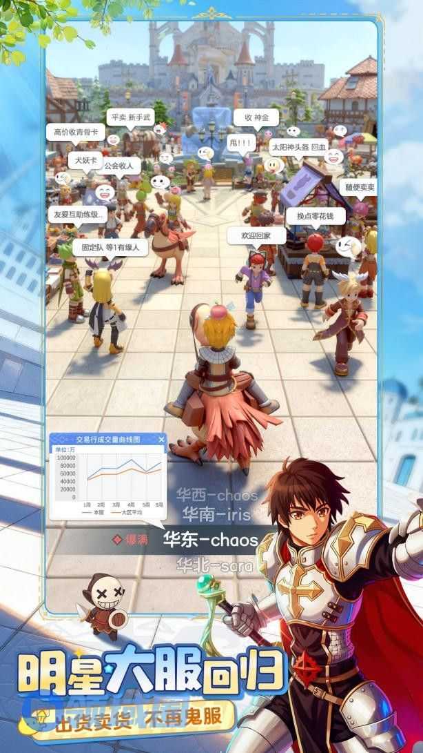 ● 老友重聚,热闹重启:华东-chaos、华南-iris、华北-sara、华西-chaos···经典大服回归,和老友重聚,重温往昔友情。在这里,你将不再孤单,出货、卖货、组队、聊天,一切就像当年一样自然。