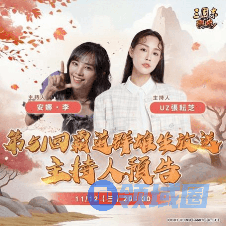 台湾光荣特库摩宣布,由三国志系列之本家光荣特库摩重磅推出 MMO 战略模拟手机游戏『三国志 霸道』将于 11 月12 日(三)20:00 GMT+8 于官方 Facebook粉丝专页与台湾光荣特库摩 YouTube 频道举办《霸道群雄生放送》第 51 回直播活动,节目将由知名歌手及主持人-安娜·李、以及户外健美知名演员-UZ 张耘芝联手主持,并与台湾光荣特库摩亚太地区董事暨副总经理 刘政和先生一起与玩家们互动并带来好礼和宣布游戏最新改版信息以及活动预告。