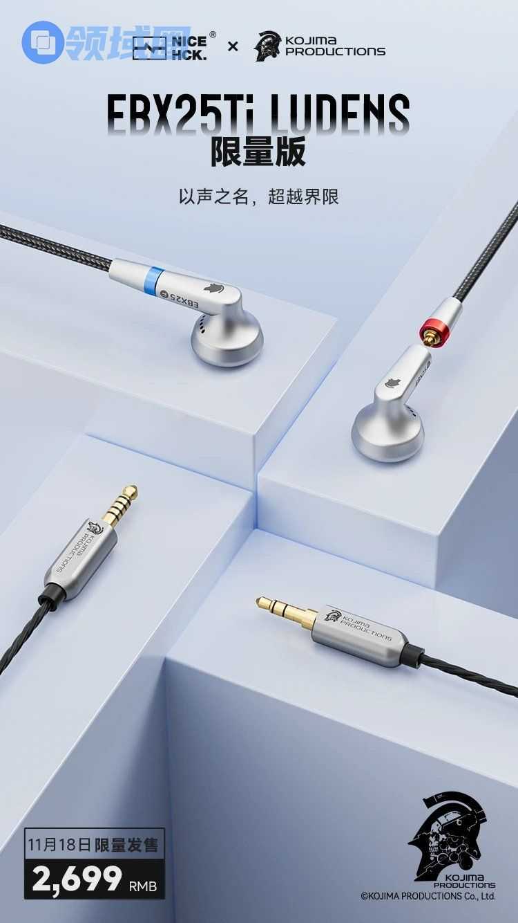 国内音频品牌NICEHCK(原道)近日正式宣布,与知名游戏开发团队小岛工作室(KOJIMA PRODUCTIONS)达成合作,共同推出联名限量款耳机——EBX25Ti LUDENS,将于11月18日20:00在天猫NICEHCK旗舰店及京东NICEHCK官方旗舰店同步发售,售价定为2699元。