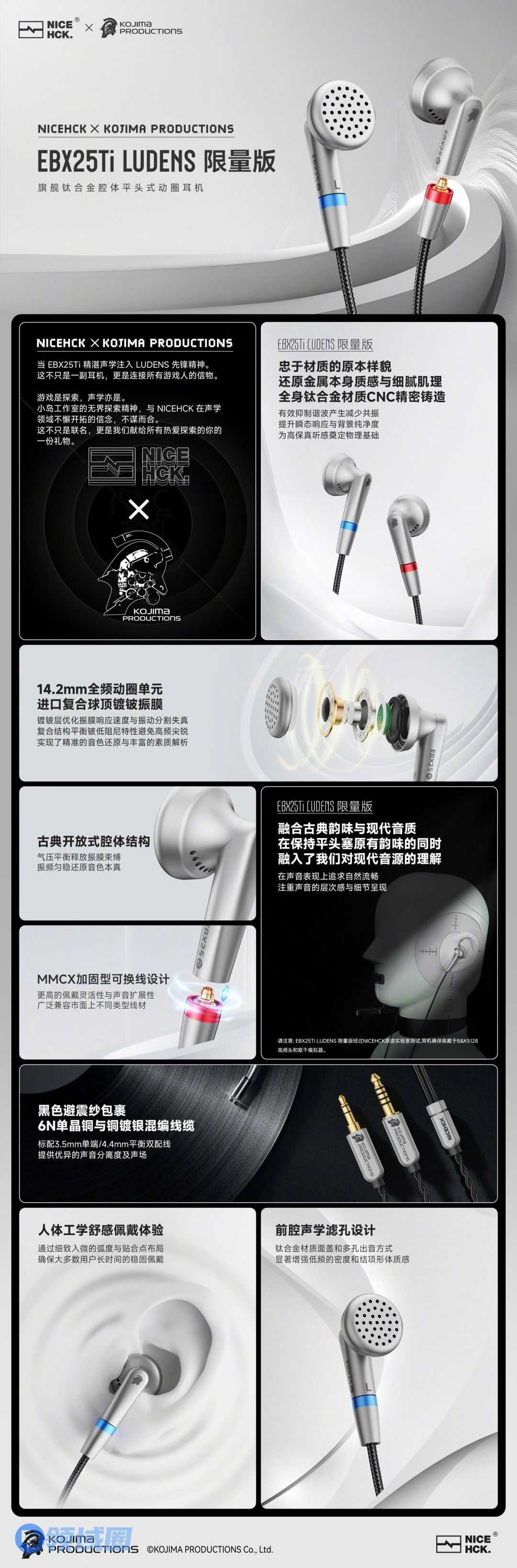 此次合作以“探索声音的未来”为主题,将NICEHCK在声学领域的专业技术与小岛工作室代表性的“LUDENS”先锋设计理念相融合。官方表示,EBX25Ti LUDENS不仅是一款耳机产品,更希望成为“连接所有游戏人的信物”,在音质与视觉设计上实现双重突破。