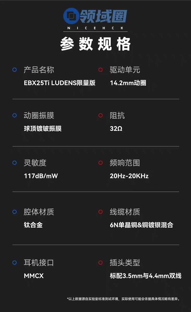 作为一款定位高端的限量产品,EBX25Ti LUDENS采用了钛合金材质与开放式腔体结构,搭载14.2mm全景声动圈单元,结合声学滤孔设计与MMCX旗舰接口配置,力求在声音层次与细节表现上达到更高水准。耳机整体设计延续了小岛工作室一贯的未来感美学风格,强调金属质感与人体工学的结合。