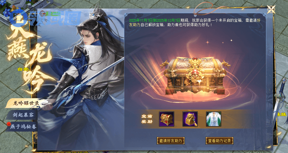 龙吟昭世录活动上线,邀请好友得宝箱,助力成功即可获得新款永久时装奖励!