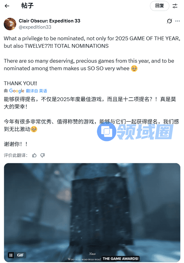 在TGA提名发布后,《光与影:33号远征队》官方在社交媒体X上发文致谢。