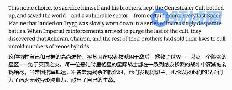 之后在战锤官方网站的一篇设定更新中写道,阿切兰牺牲了。除此之外,还有一位在游戏中和泰图斯并肩作战到底的猛男梅杜拉斯·凯隆也已确认牺牲。据官方描述,他们是在清剿巢都星球特里格上的基因窃取者教派时不幸牺牲的,当增援部队赶到时,他们已经用自己的生命换取了无数异形的毁灭。
