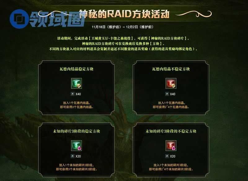 还有“神秘的RAID方块活动”,英雄们在活动期间完成指定战役,可获得“神秘的RAID方块碎片”,碎片可以在兑换商店兑换多种“方块”,不同的方块放入对应的材料道具,会复制并返还不同数量的奖励道具。