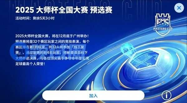 在【大师杯全国大赛 预选赛】活动中,你将执掌选择的球队与Al或其他玩家展开竞争。排名最高的4名玩家还可获得2025《实况足球》大师杯全国总决赛线下席位!