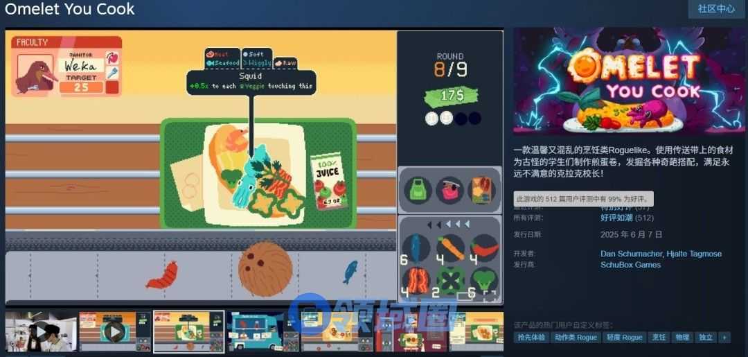 《Omelet You Cook》是一款烹饪类的卡牌肉鸽游戏,玩家将扮演学校食堂的厨师,在满足个性丰富学生们要求的同时完成料理。本作于2025年6月8日以抢先体验形式发布的作品。开发工作由两人组成的独立工作室负责。玩家们对其短时间内即可享受的爽快游戏节奏、轻松的艺术风格以及丰富的内容给予了高度评价。自发售日以来,游戏获得了500多条评论,其中无一例外全是好评。
