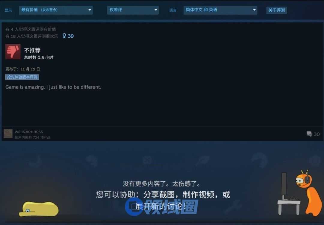 然而,在11月19日,某玩家提交了第一条差评。该评论写道"游戏非常棒。我只是想与众不同",似乎在称赞游戏质量的同时,表示自己只是想与其他用户不同,故而特意给出了差评。