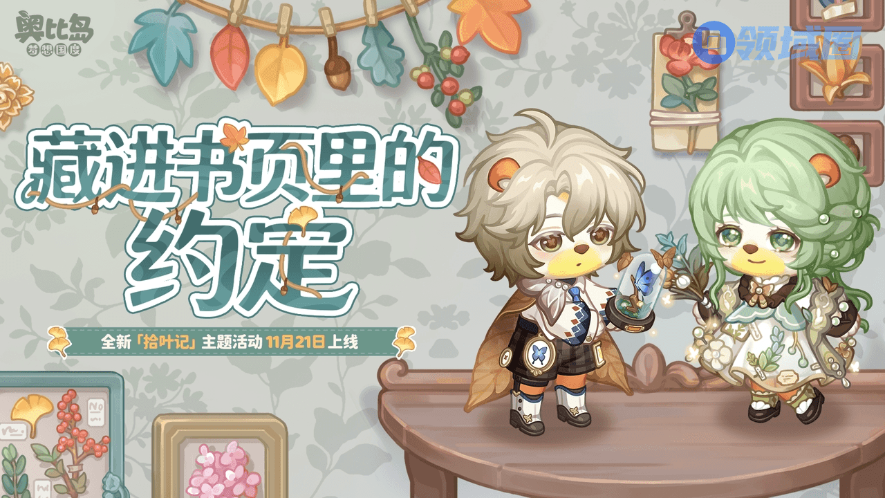 11月21日5:00-12月4日23:59期间,参与「拾叶记」活动可获得活动限定奖励,奖励包括服装「秋蕨映象系列」「枯叶蝶记系列」「秋色拓印碎花裙」「浅棕蝶叶子马甲」,家具「标本室系列」,还有全新的头像框「拾光藏叶」,背景卡「拾叶寄情背景」,背景装扮「叶子标本灯」,动作装扮「植物之灵手风琴」,双人动作「呼呼落叶飞」,双人座垫「叶语扉页」及晨星品质称号「拾一叶秋光」等惊喜礼物!此外,在本次活动中集齐全部奖励的小奥比,还可获得限定装扮「空间开场(花叶)」。