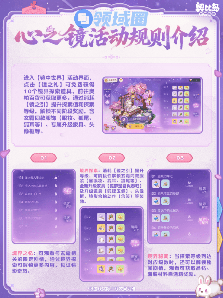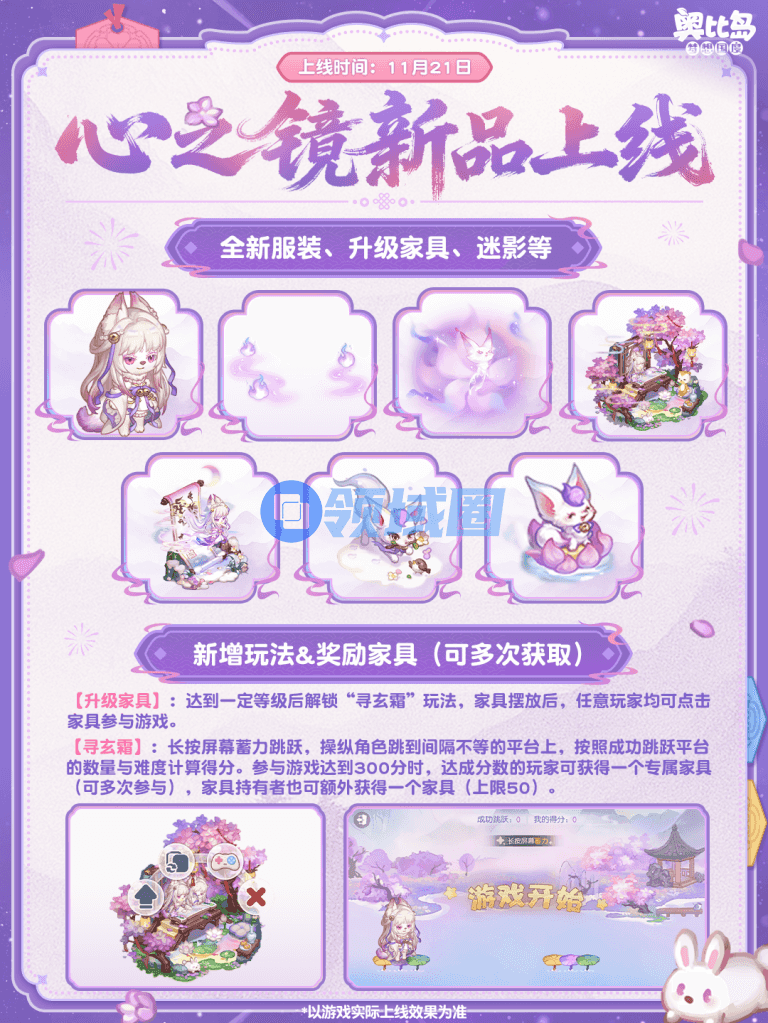 【心之镜-玄霜】「心镜迷影」于11月21日限时开启,在活动开启期间参与【心之镜】限时活动,可通过【镜之礼】免费获得10个镜界探索道具!活动限定奖品包含全新晨星品质升级家具「狐梦逢君似春归」、特殊升级道具「狐狸玉佩」、晨星品质家具「狐灵画境」、典藏品质家具「雪中萌狐」、时装「玄霜系列装扮」、头像框「绒尾轻拥」、聊天气泡框「狐隐狐现」。