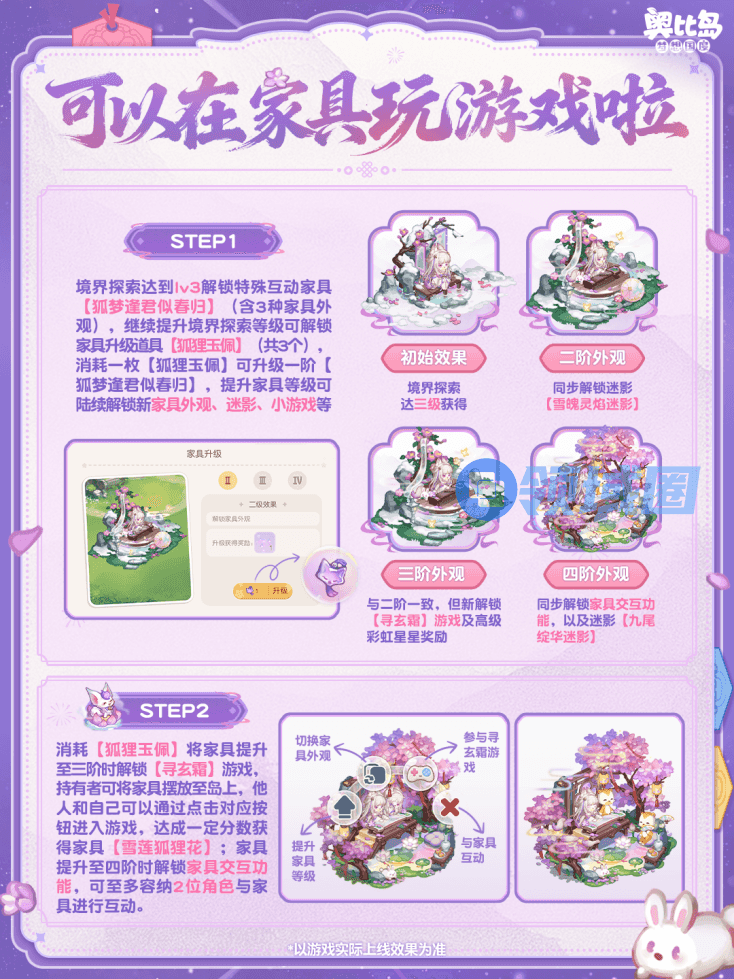 注:特殊升级道具「狐狸玉佩」可用于升级家具「狐梦逢君似春归」;升级奖励包括晨星品质迷影「九尾绽华迷影」,典藏品质迷影「雪魄灵焰迷影」等内容,小奥比们快去体验吧!