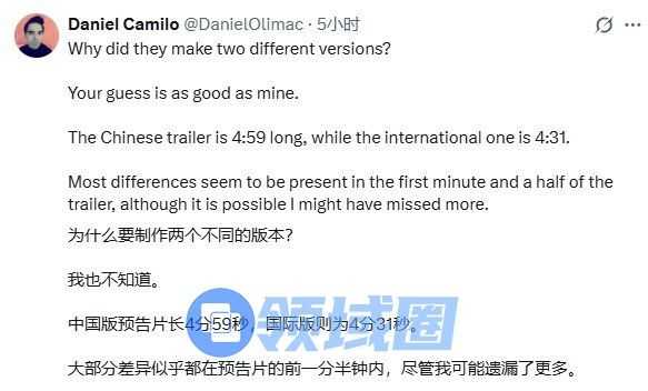 这一发现最初由细心的玩家通过社交媒体分享。该玩家将Xbox合作伙伴预览会上发布的国际版预告片(底部)与工作室发布的中文版本(顶部)进行了逐帧对比。结果显示,中文预告片全长4分59秒,比国际版的4分31秒多出近半分钟(排除片尾logo后的统计时长)。据分析,这些差异主要集中在影片的前一分半钟,中文预告包含了额外的角色对话和独特的视觉元素,使得故事背景的铺垫更为详尽。