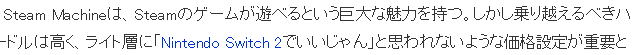 ·对于想玩更多海量PC端游戏的玩家来说,适当的将设备与性能折中也能接受,或许就是V社推出Steam Machine的核心原因,结论是一切的关键都取决于价格,尤其是日本市场,价格高于目前定价低PS一档的Switch 2,将会极大的削弱玩家的购买欲。