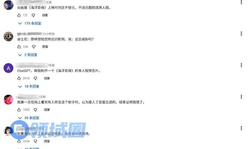 截至消息发布时,该预告片已获得超过715万次观看,但点赞仅4万,而点踩数高达10万。用户们在评论中指出,原版动画电影还没老到需要推出翻拍版的程度。有些人甚至觉得,这支真人版《海洋奇缘》的预告片看起来像是人工智能生成的。