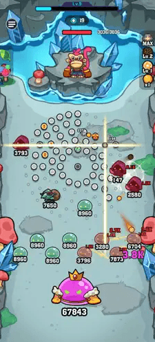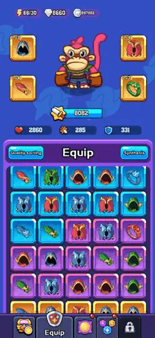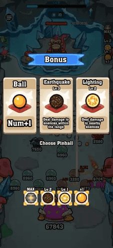 介绍:上方是猴子,防守底部每回合上来的各种敌人,中间是弹球弹针区域,猴子可以选择方向,扔下去弹球在弹针之间反弹触发各种弹球的技能。有很多属性的弹球,比如大地、闪电、冰冻、火焰等,不同弹球有不同的能力。击败敌人获得经验,升级后可以选择bonus效果,也有类似弹壳的2合1强力弹球的设置。整个外围养成部分也很像弹壳。
