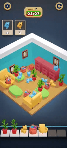 介绍:超出预期,玩法本身还是3D TileMatch,可以理解为Match Factory的玩法。同时又兼具等距视角的2.5D单独房间关卡。另外,房间中的摆放是手动摆的,并非随机,比如桌椅、比如多米诺骨牌等等,各种物品并不像很多传统的3D TileMatch是俯视视角直接“随机”摆在地面上。