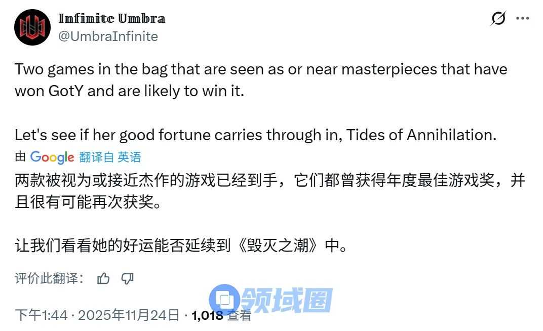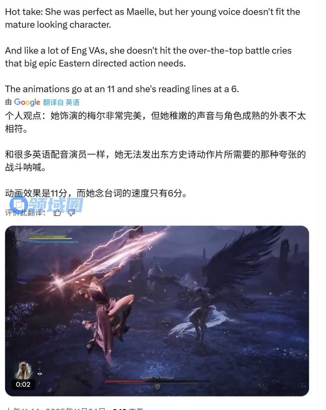 也有网友补充说Jennifer English曾在《艾尔登法环》中饰演拉滕娜,考虑到《艾尔登法环》、《博德之门3》都赢得了年度游戏,而《光与影:33号远征队》刚刚夺得了2025年金摇杆奖年度游戏,三重buff的她被国外网友认为是赢得年度最佳游戏的“关键因素”,甚至是年度游戏的吉祥物。