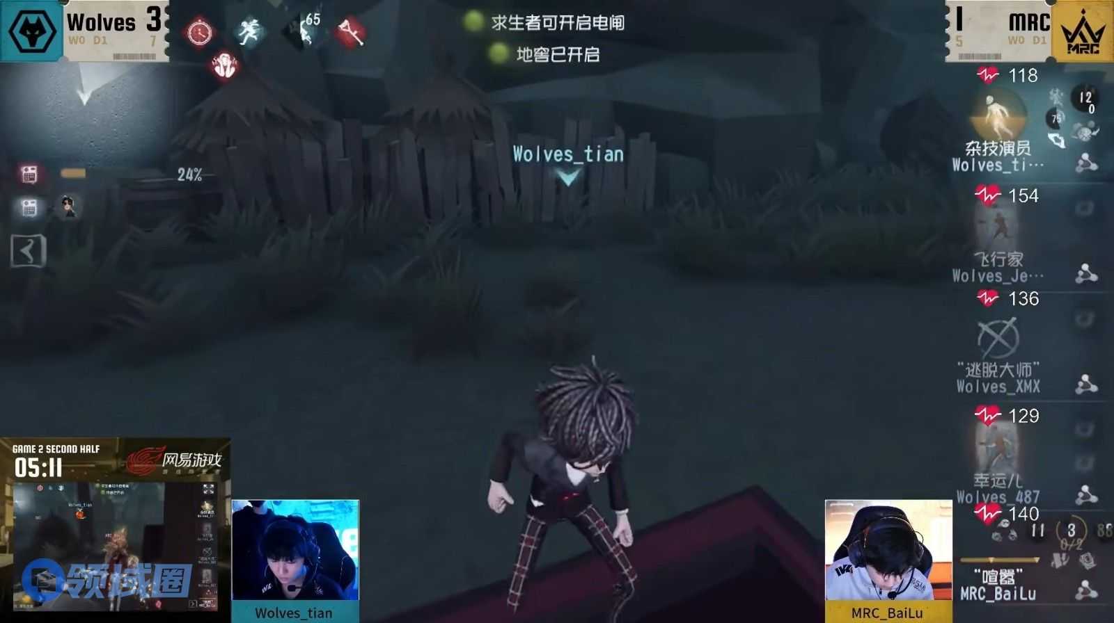 第一天,MRC vs 成都Wolves第二局下半场来到湖景村,MRC_BaiLu“喧嚣”前往双十一追击Wolves_XMX“逃脱大师”, Wolves_XMX果断释放迷烟炉干扰监管者视线并游走于其中,使MRC_BaiLu释放分身后也只为“逃脱大师”附加一个惊吓标记,同时拉开了一个很安全的身距。待Wolves_XMX释放第二个迷烟炉准备继续牵制时,MRC_BaiLu灵活应对,选择不在“逃脱大师”身上浪费过多时间,转身追击在小船修机的Wolves_487幸运儿,但Wolves_487已经提前做好准备,手上牵制道具充裕。在他翻窗跳下小船的同时,MRC_BaiLu释放移形快速跟上,Wolves_487摇动海神怀表,虚实莫测的走位让对手找不到切入点,在海神怀表持续时间即将结束的时候释放忘忧之香并翻板,极限回溯避免被恐惧震慑击倒,而后利用飞轮规避双重惊喜附加双重标记,虚晃身位假装翻板实则前行,骗出“喧嚣”的绕场谢幕,最终在短板区成功牵制将近三台密码机。Wolves_XMX使用逃脱术将幸运儿转移到方便自己救援的狂欢之椅,在MRC_BaiLu拦截“逃脱大师”的过程中,触发其双重误导,使其无伤救援,而后MRC_BaiLu为压制求生者方状态,继续对“逃脱大师”造成伤害,在此期间幸运儿也得以拉点至船头海边。因前期追击节奏较慢,MRC_BaiLu选择直接传送管控密码机并将Wolves_XMX“逃脱大师”留在遗产机附近,成都Wolves求生者果断布排飞行家在船头开启新机,幸运儿翻找箱子,提前将机械傀儡布置在大门,并同时和Wolves_tian杂技演员配合一起营救“逃脱大师”,为杂技演员分摊救人压力——一旦“喧嚣”回防幸运儿救人,就会为杂技演员让出较大身位,使其拦截计划落空。最终MRC_BaiLu选择专注追击杂技演员,求生方也在杂技演员倒地的一瞬间成功亮机,幸运儿将人救下,也同时向监管者传递一个信号:在狂欢之椅附近有两个人,此时立刻回去也许能逮捕两人,比单独追击杂技演员的收益更大。MRC_BaiLu成功将“逃脱大师”淘汰,Wolves_tian杂技演员利用报幕迷惑监管者,使其误以为杂技演员还在点门,实则在报幕消失的一瞬间,Wolves_tian向海边地窖跑去,最终成功三人三跑!