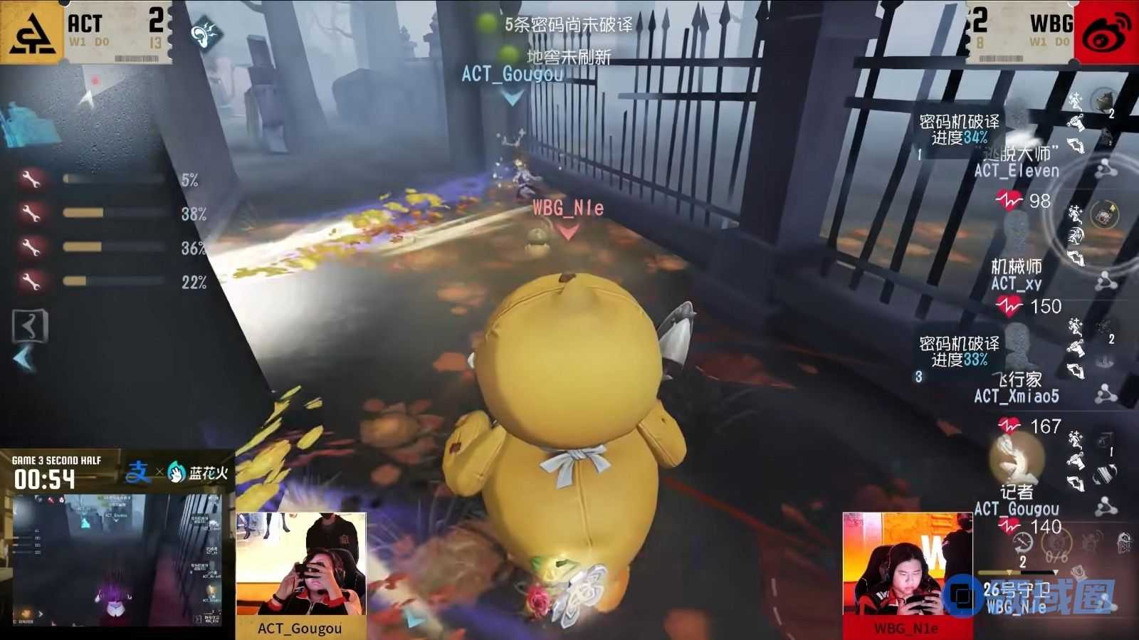 第二天,北京WBG vs ACT第三局下半场,WBG_N1e 26号守卫开局前往红教堂墓地追击ACT_Gougou记者,十秒内成功对其造成三次炸弹伤害,而后单炸弹将其极速击倒。ACT_Eleven“逃脱大师”使用逃脱术将其换位到自己附近的狂欢之椅,并使用迷烟炉阻碍监管者自由释放炸弹,利用被动特质从大房窗口翻出并快速接近狂欢之椅,在监管者擦刀期间忙不迭地等待椅下炸弹爆炸成功将人救下,为观众展现了一次非常稳健的救援。WBG_N1e回头为“逃脱大师”补上一颗炸弹造成双倒局面,再跟随记者来到墓地,利用炸弹卡住板子实则直接过板,使记者来不及释放牵制幻影就已经被造成伤害并将其淘汰。WBG_N1e利用移形追击半状态“逃脱大师”,守椅阶段ACT_Xmiao5飞行家利用震颤起飞迷惑监管者视线,然后使用飞行器快速将人无伤救下并扛刀,电光火石之间使监管者措手不及。二次击倒“逃脱大师”后,WBG_N1e将其挂至小木屋地下室,因ACT_xy机械师出现极快,使监管者误以为密码机已经压好,WBG_N1e选择用炸弹将人击倒压起身,这期间WBG_N1e心态略显急躁,炸弹铺设形式过于单一,都被求生者灵活躲开,导致炸弹难以为继,这反而为外围飞行家拖出修机时间。但因地形优势,求生者难以突出地下室,最终还是被WBG_N1e抓住机会,开门战快速减员,收获三抓,在第一局被8:1积分大劣的情况下成功翻盘!