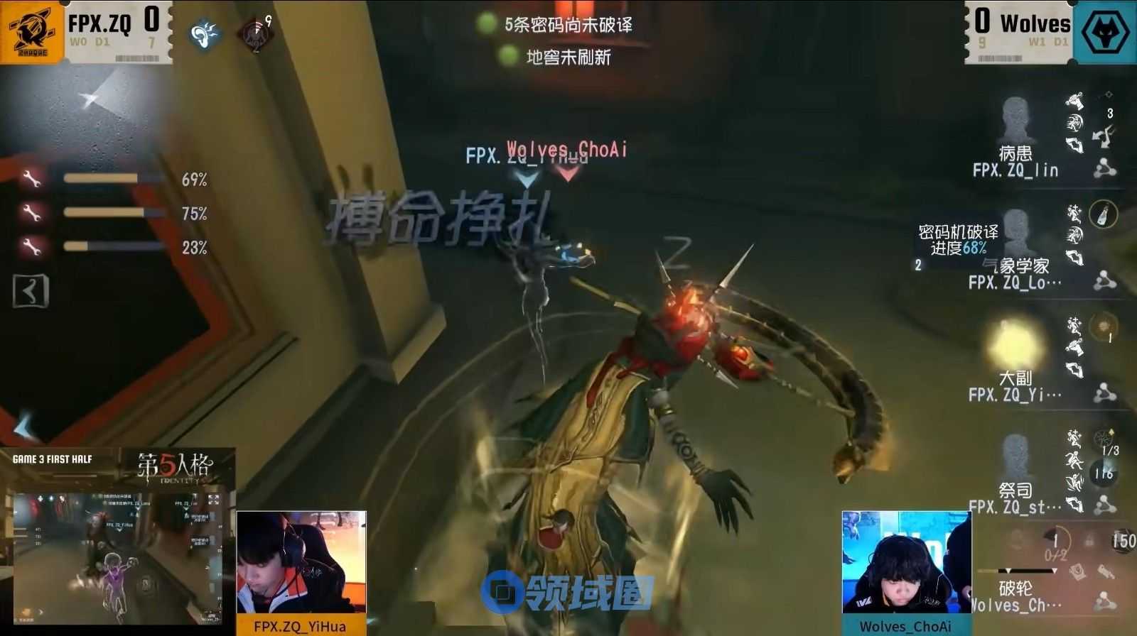 FPX.ZQ vs 成都Wolves第三局上半场来到唐人街,开局Wolves_ChoAi破轮快速为FPX.ZQ_YiHua大副上一层穿刺,FPX.ZQ_YiHua果断摇动海神怀表逼迫Wolves_ChoAi再次变换轮形态,在催眠效果即将消失的时候转上大房二楼利用高低差规避钉板架点,同时极限续出第二块海神怀表,但因为摇动怀表的一瞬间会以大副本体为中心发散出催眠波纹,在FPX.ZQ_YiHua晃动第二段的时候,被Wolves_ChoAi抓住机会确定其位置,果断闪现命中本体击倒。在挂上大副的一瞬间,恰好通缉到准备救援的FPX.ZQ_stian祭司,FPX.ZQ_stian及时来到二楼拖延时间,并在破轮加速前打出上下通道,再围绕楼体和监管者进行迂回,尽可能最大化利用大副的淘汰时间。在救下大副后,FPX.ZQ_stian为大副扛刀护其上楼,Wolves_ChoAi选择继续针对大副,预判大副利用上下通道下楼,FPX.ZQ_YiHua反复利用通道牵制,逼迫Wolves_ChoAi不断切换形态,为己方争取到较多的破译时间。Wolves_ChoAi再次击倒大副后,精准找到躲在掩体后准备二救的病患,并利用穿刺之轮和戏谑叠上三层穿刺将其击倒,FPX.ZQ_Long气象学家立刻进行补救,想用层云尽快贴近狂欢之椅但被Wolves_ChoAi用气球刀造成伤害,虽成功将大副救下,但此时求生者方的状态已经非常不健康。Wolves_ChoAi选择从半状态的气象学家接续第二波节奏,精准钉板禁锢FPX.ZQ_Long将其快速击倒,同时压住遗产机。FPX.ZQ_stian准备救援,FPX.ZQ_lin在外围开启新的密码机,FPX.ZQ_stian趁监管者外出清理板子的间隙将人快速救下。在气象学家二次上挂后,Wolves_ChoAi选择管控密码机,虽然密码机已经压好,但FPX.ZQ_lin没有第一时间进行点亮,且在点亮后没有及时交出钩爪进行拉点,导致被快速击倒。Wolves_ChoAi先行压迫正在点门的祭司走位,而后回防气象学家救人,在狂欢之椅和大门之间不断拉扯,成功将病患拖至淘汰,再逐一击倒其余二人,成功收获四抓,拿下不可被反超的积分优势,宣告比赛胜利!回顾整局,Wolves_ChoAi选手的破轮还应该提高熟练度,拐角碾碎木板较为生疏,且在控场思路上不用刻意追求人员上挂,仍可以进一步精进。