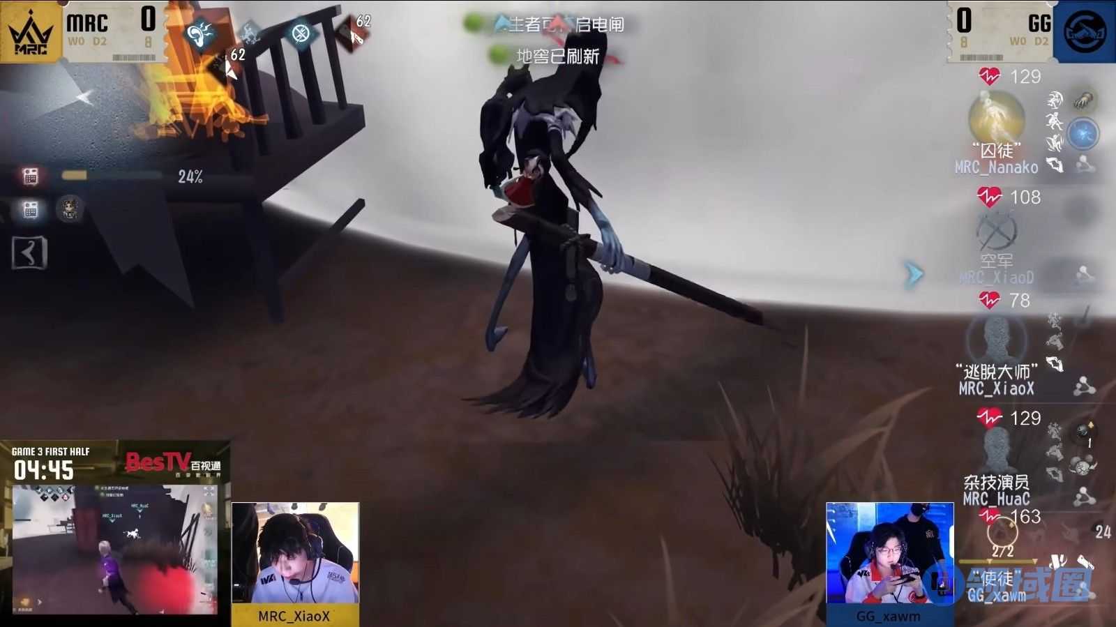 第三天,MRC vs 成都GG第三局上半场,GG_xawm“使徒”直接锁定医院内MRC_XiaoD空军,使用爱猫扑袭空军,并隔板对其造成双次眩晕,踩板过后空军禁锢已经解除,GG_xawm扭转身位至墙壁后防范信号枪方才出刀,细节拉满。MRC_Nanako“囚徒”释放强电流并下板拖时间,使空军顺利转入女神像废墟板区,但MRC_XiaoD没能及时拉开移形落点而被“使徒”踩影击倒。考虑到信号枪在手仍有二次牵制空间,MRC_XiaoX“逃脱大师”将其挪至医院缺口前的狂欢之椅,MRC_HuaC杂技演员前来救援,GG_xawm利用爱猫将杂技演员眩晕,将空军淘汰进度强行拖至过半而后逼其秒救,在此情况下杂技演员只得以命陪跑,欲使用缺口卡位策略但监管者灵活一扭,从缝隙中顺利走出,逼出MRC_XiaoD信号枪,第二次MRC_HuaC在鸟笼板处成功卡位,帮助空军拉开较大身位,MRC_XiaoD灵活使用飞轮进板,使监管者使用移形才能将其击倒,此时场上密码机也即将压好,他和杂技演员的配合扳回了前期过半秒救的劣势,逼出辅助特质也为队友后续开门战的运营减缓一定的压力。开门战阶段,GG_xawm选择管控大门,顺利将“囚徒”击倒后,因顾忌在女神像亮机的“逃脱大师”破译大门便前去侦察,MRC_XiaoX再次使用逃脱术将“囚徒”挪至侧门附近,GG_xawm见狂欢之椅位置变化,意识到求生者企图救人,但距离过远还是给带有化险为夷的MRC_XiaoX贴近狂欢之椅的机会,GG_xawm挥刀触发双重误导的同时不慎将身位置于板子之下,使MRC_XiaoX成功砸板顺利将人救下。虽然GG_xawm极力利用自身模型卡位想把化险为夷的时间拖出,但在门口释放爱猫的时候,MRC_Nanako释放强电流使其不能在合适时机分裂爱猫扑咬住自己,最终成功三人三跑,突破长平僵局,提前打出优势。