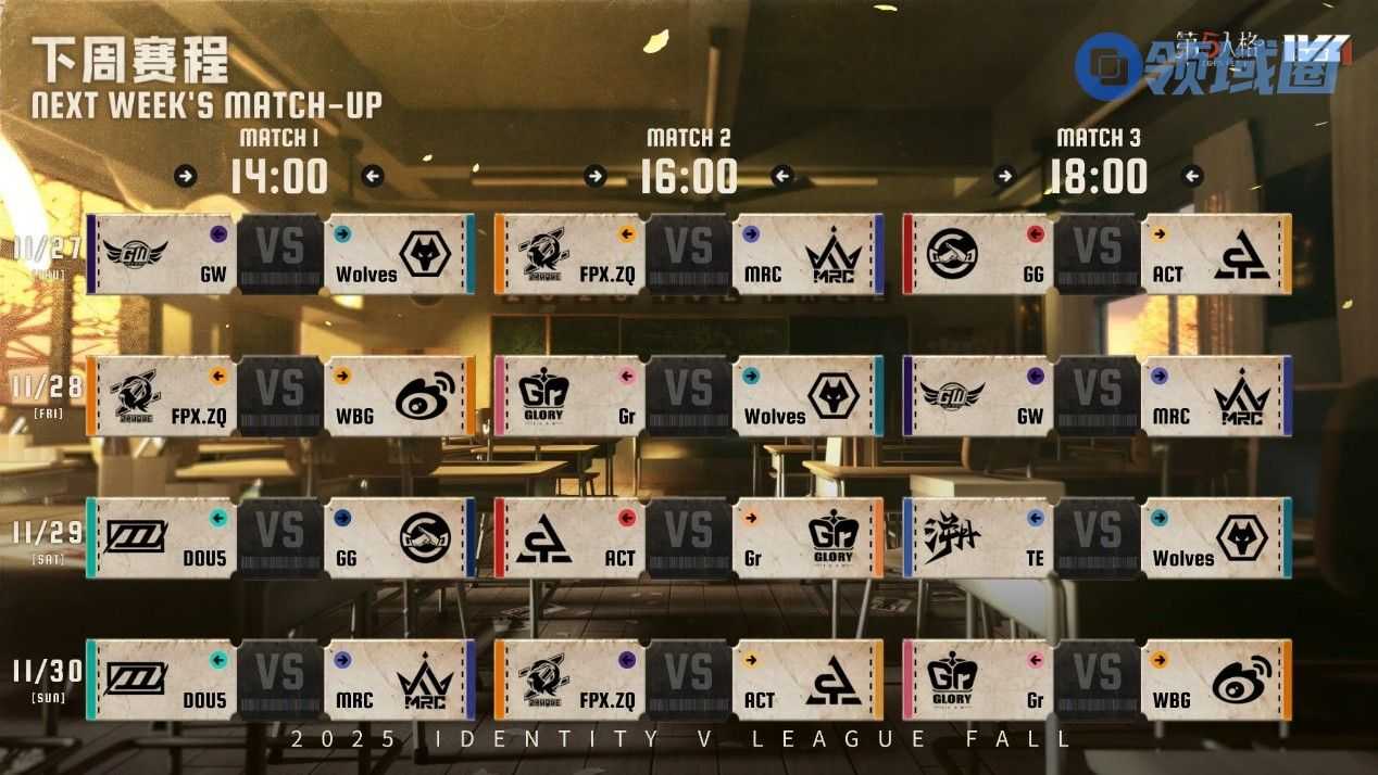 下周便是本赛季常规赛的定榜之战!风云激荡,成都GG能否有机会冲进胜者组的行列,北京WBG,成都Wolves能否稳住自己的优势位置?FPX.ZQ战队和ACT战队狭路相逢,每一分都将是通往附加赛的生死符,谁能争取到最后的附加赛资格?预祝各支战队都能取得满意的成绩,战鼓擂动,烽火昭昭,敬请锁定11月27日14:00第五人格赛事直播间,让我们一同期待最终的定榜结果!