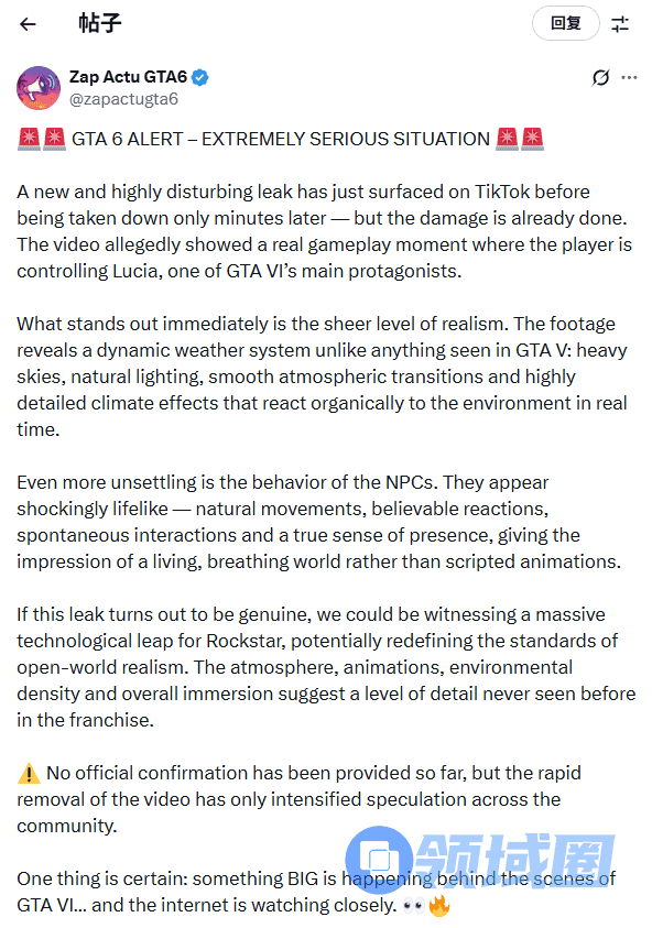 近日,推主@zapactugta6发文表示,一段《GTA6》的泄漏视频在上发布,几分钟后便被删除,
