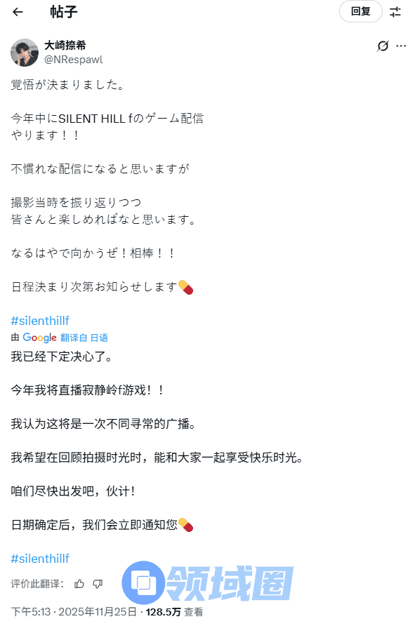 大崎捺希在社交平台X上表示,今年之内,自己会进行《寂静岭f》的游戏直播。虽然直播方面可能不太熟练,但他希望能一边回顾当时的拍摄经历,一边和大家一起享受乐趣。日程确定后会再通知大家。