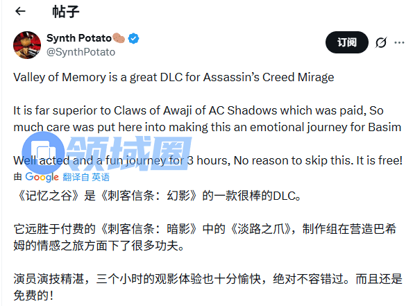 内容创作者Synth Potato在社交媒体上表示,《刺客信条:幻景》的DLC“拥有完整的过场动画,让人印象深刻”,并称这体现了系列叙事水准下降,因为他“已经很少看到带有明确导演意图的表演”。他还指出,《刺客信条:幻景》的剧情体验“明显优于《刺客信条:影》的付费DLC《淡路之爪》”。