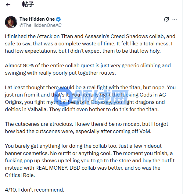 另一名玩家TheHiddenOneAC对《刺客信条:影》的《进击的巨人》联动评价不佳,称其是“一场完全浪费时间的体验”,并指出约九成内容仅是“普通的攀爬与摆荡路线”,且设计粗糙。他还对无法与巨人战斗表示失望,认为此前系列已与诸神、神话生物等战斗过,但这次却未实现类似内容。