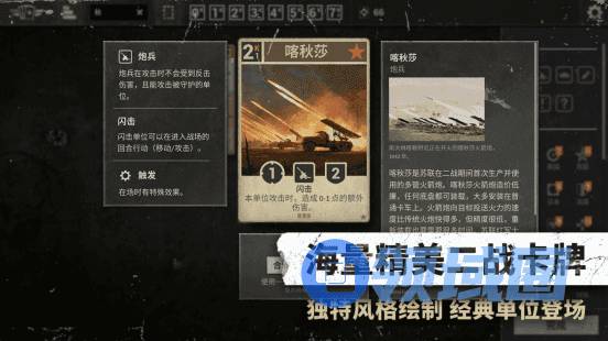 游戏中的卡牌设计灵感均源于真实的二战历史元素,不论是曾经驰骋沙场的德国陆军王牌“虎式”坦克,还是拥有美妙名字的苏联“喀秋莎”火箭炮,各大阵营的顶级战斗武器都将在游戏中呈现。