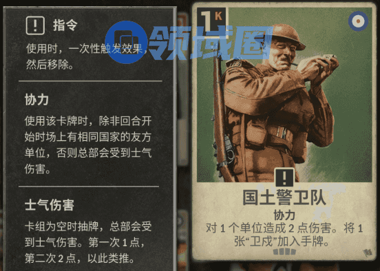 “国土阵线”扩展包最核心的创新点,在于引入了前所未有的“协力”机制。这一机制要求玩家在使用特定卡牌时,场上必须有相同国家的友方单位,否则总部将受到士气伤害。