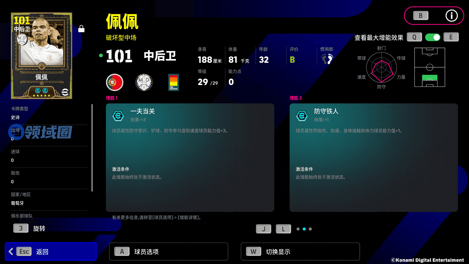 佩佩增能属性为【一夫当关 +3】,防守意识和铲球的增强让“武僧”的铲断凶狠且精准!他还自带【伸脚抢截】和【后防领袖】的特殊技巧,再加以出色的防守四项,“武僧”的世界级防守能力将重现实况赛场!