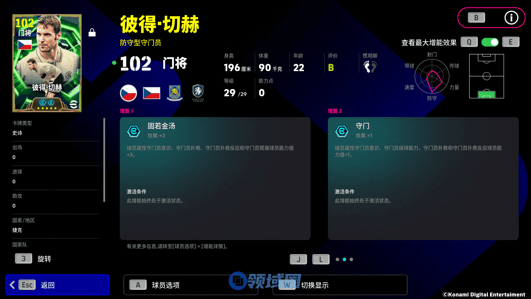 切赫增能属性为【固若金汤 +3】,守门能力的全面提升让他在门前稳如泰山!