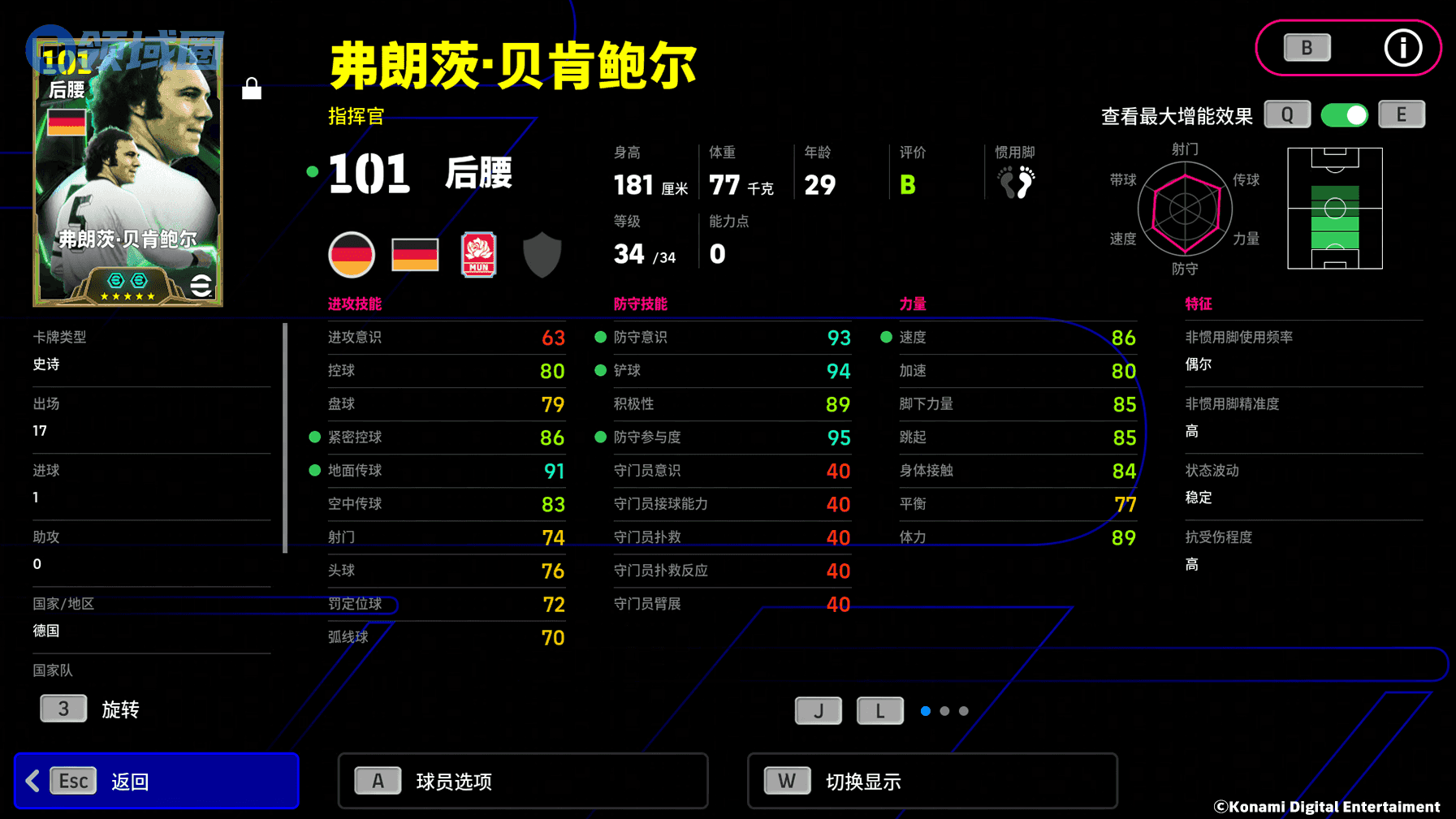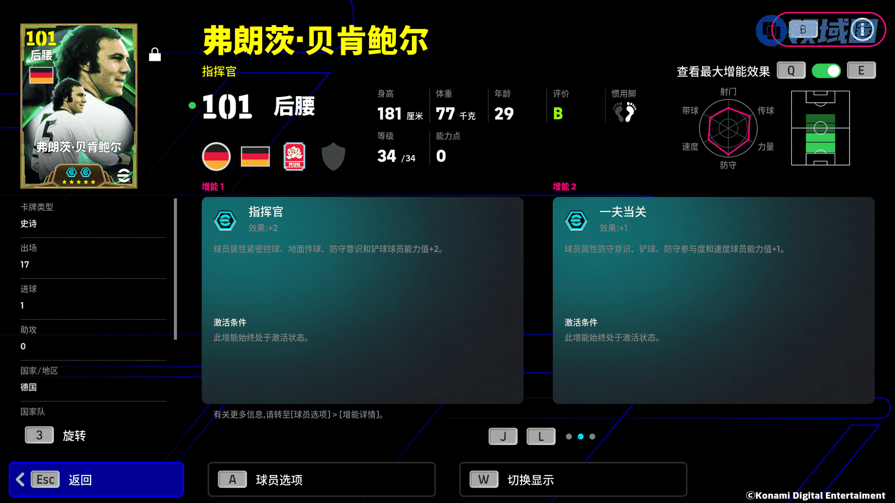 贝肯鲍尔拥有【指挥官 +2】的增能加成,攻防能力的同步增强让他在中场运筹帷幄!