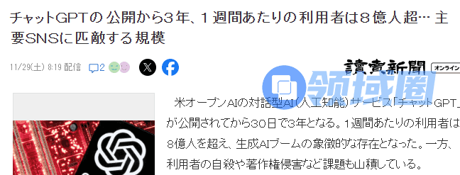 不知不觉,引领AI狂潮的领军企业OpenAI拳头产品chatgpt在11月30日将迎来诞生三周年,最新数据显示周活用户超8亿,足以匹敌当今世界的顶级SNS平台。