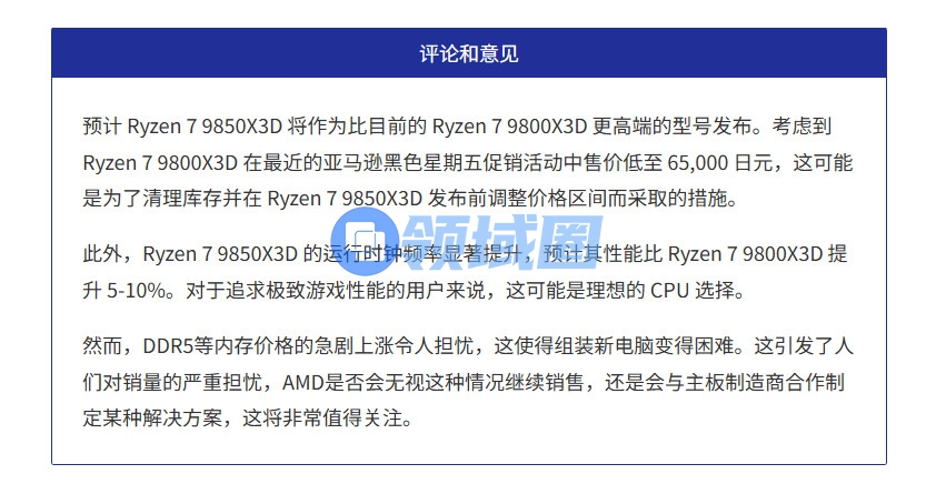 有泄露消息称AMD计划在2026年1月左右发布多款搭载3D V缓存的新产品,其中性能超过现有顶级游戏型号Ryzen 7 9800X3D的Ryzen 7 9850X3D已经出现在了AMD官网上。