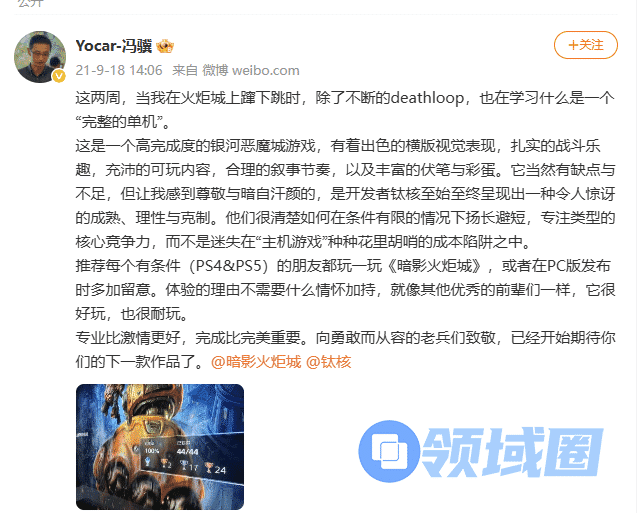 除了很多媒体给出高分评价外,游戏还出现在央视2021年年度总结长绘卷中,同时被索尼互娱前总裁吉田修平选为2021年最喜欢的游戏。就连2021年还忙着制作《黑神话:悟空》的冯骥也在体验两周之后特意发微博表达了赞美。