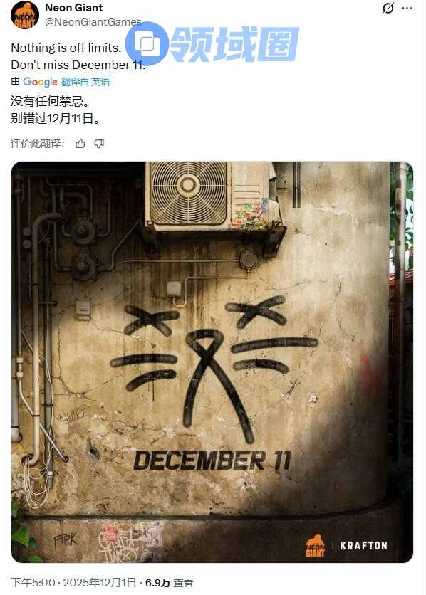 随着TGA颁奖典礼临近,越来越多的开发商确认将参与此次活动,其中就包括凭借《上行战场》名声大噪的Neon Giant。该工作室发布预告,宣布将于12月11日揭晓新作,并配文“百无禁忌”以及一个悲伤猫咪脸的涂鸦图案。
