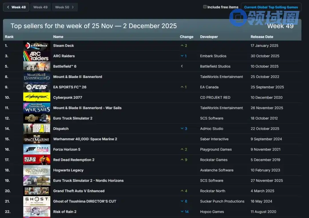 Steam 2025年最新一周游戏销量排行榜出炉(2025年11月25日-2025年12月2日,无免费游戏),搜打撤《ARC Raiders》热度不减,依旧压了《战地6》一头,已经连续霸榜超一个月,除此之外,《骑马与砍杀2》或因其DLC发售的原因重回榜单,与其DLC分别登上了第三名和第六名,还有各种3A大作,如《赛博朋克2077》也回到了榜单之中,位列第六名,让我们一起来看看具体前十名有哪些大作吧!